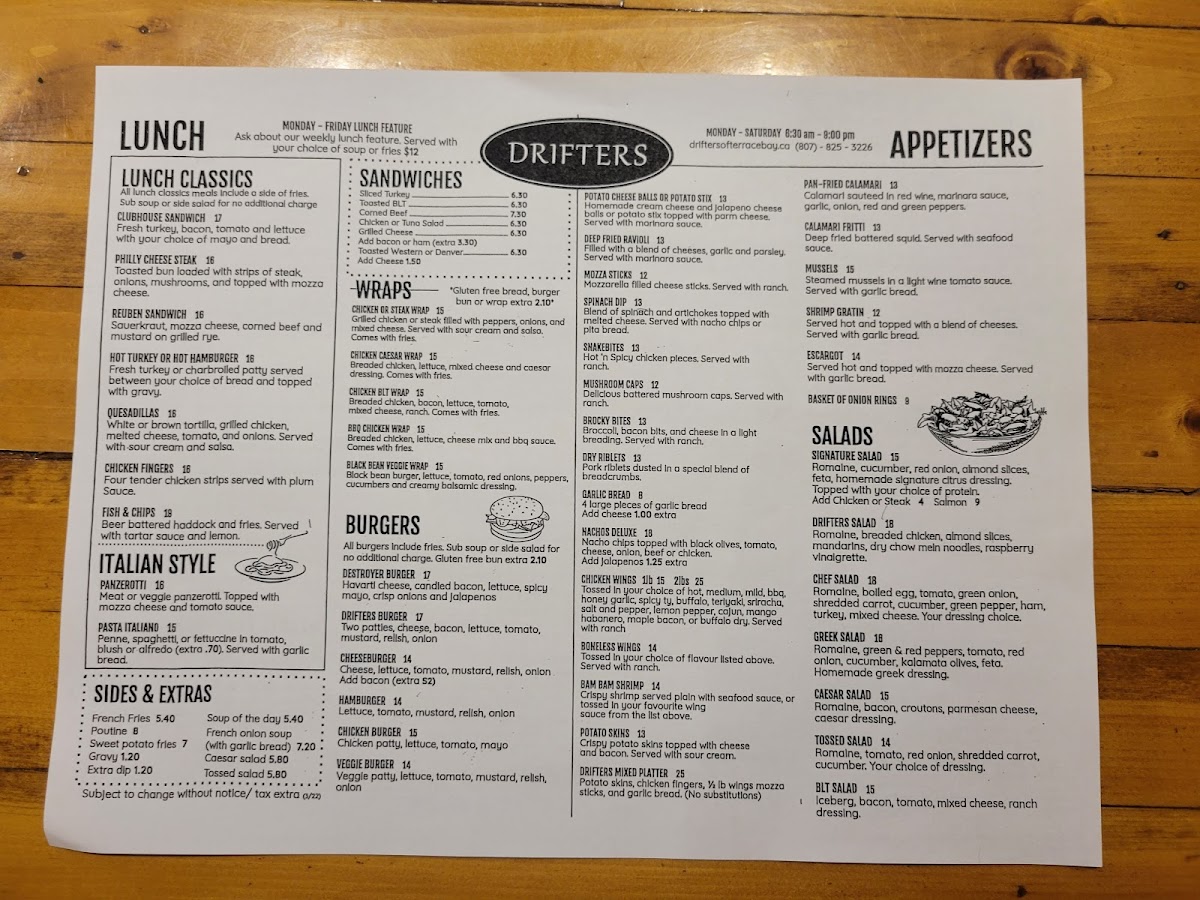 Welcome to Drifters Restaurant, the culinary gem of Terrace Bay, located conveniently at 3 Simcoe Plaza. This local favorite has earned rave reviews for its handcrafted burgers, succulent chicken fingers, and mouthwatering wings, all served in a cozy, welcoming atmosphere reminiscent of a charming tavern with a touch of class. Customers frequently note the impeccable service and friendly staff, creating an inviting space to enjoy meals with family and friends.